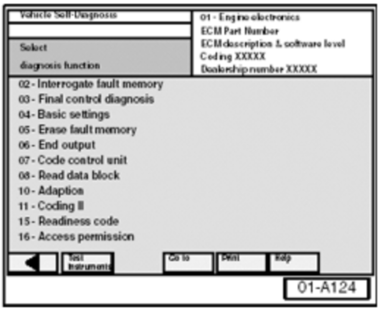 - Select vehicle system "01 - Engine electronics". Select Diagnosis Function "04 - Basic settings".