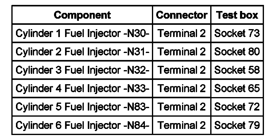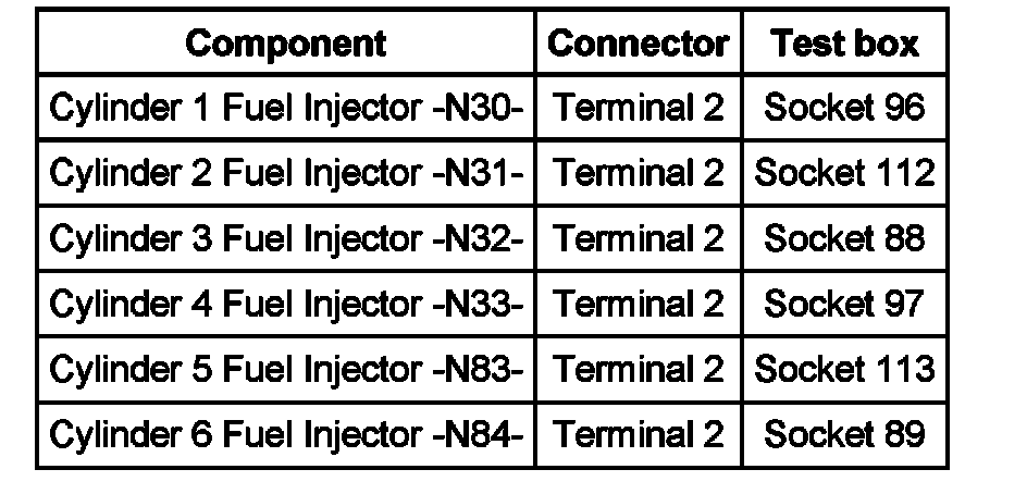 - The respective fuses of Cylinder 1 Fuel Injector -N30- to Cylinder 4 Fuel Injector -N33-, Cylinder 5 Fuel Injector -N83-, Cylinder 6 Fuel Injector -N84- must be OK