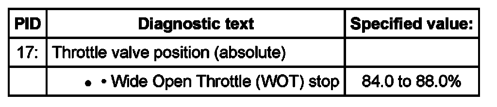 - Check specified value of throttle valve position (absolute) at Wide Open Throttle (WOT) stop: