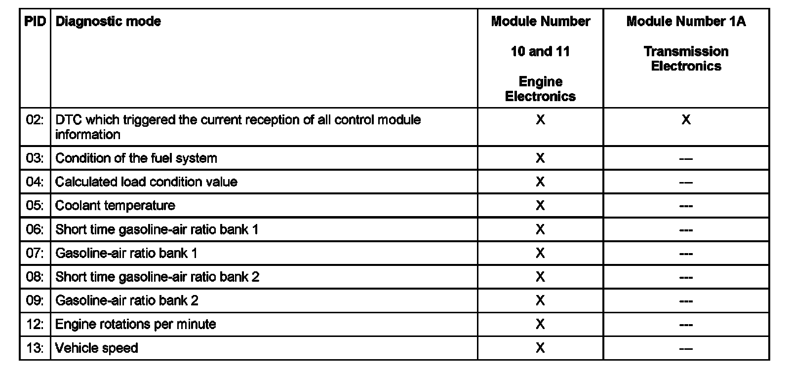 This diagnostic mode displays the operating conditions at which an emission relevant malfunction was detected and stored by the Engine Control Module (ECM) and Transmission Control Module (TCM).
