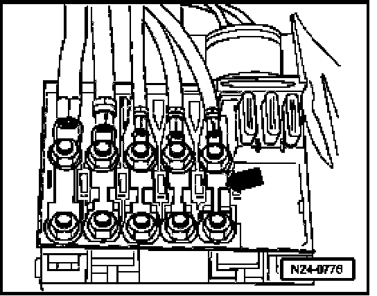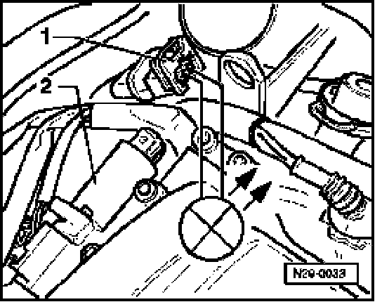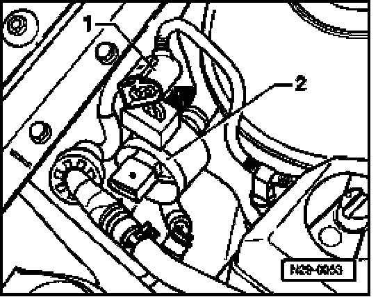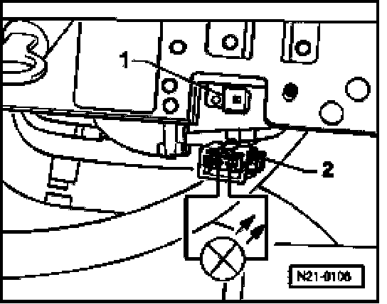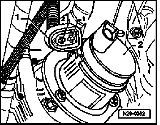 - Pull connector -1- off solenoid valve -2- and connect V.A.G1527B voltage tester with adapter cables from V.A.G1594 to disconnected connector.