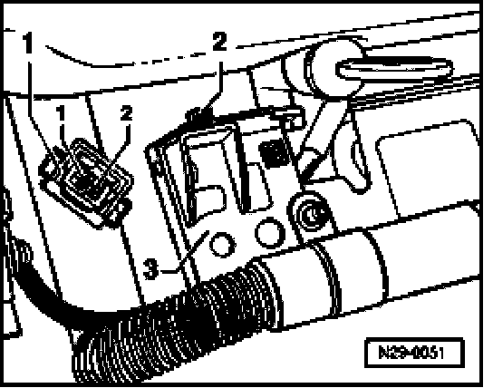 - Pull connector off solenoid valve -1- and connect V.A.G1527B voltage tester with auxiliary cables from V.A.G1594 to disconnected connector contacts 2 + 3.