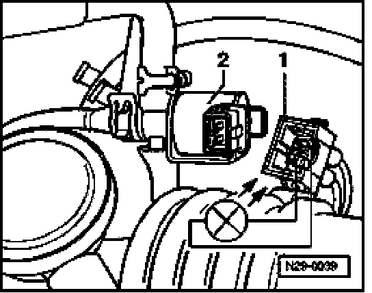 - Pull 2 pin connector -1- off secondary air injection pump motor -2- and connect V.A.G1527B voltage tester with aux. cables from V.A.G1594 to disconnected connector.