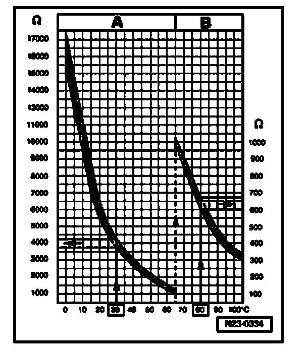 Range A displays resistance values for the temperature range of 0 to 65 degrees C, range B displays resistance values for the temperature range of 65 to 100 degrees C.