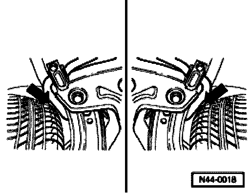 The distance between front axle components and tires - arrow - must be the same at full lock (full turn left/right).