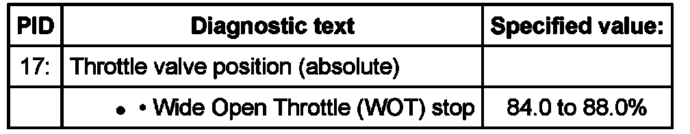 - Check specified value of throttle valve position (absolute) at Wide Open Throttle (WOT) stop: