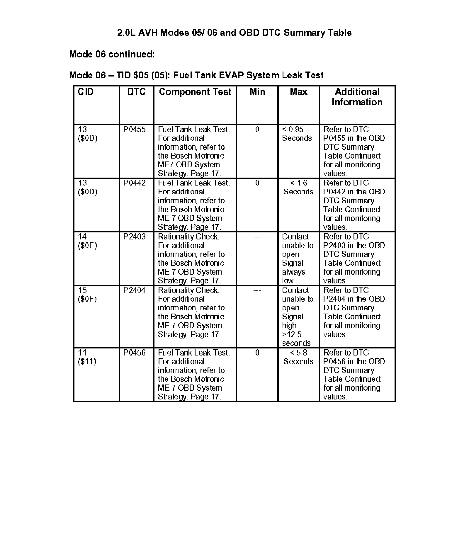 Modes 05/06 and OBD DTC Summary Table