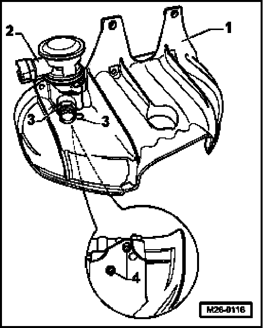 - Guide a 5 mm hex socket head bolt into holes -3- of warm air collector plate -1- and remove bolts -4- for combination valve -2-.