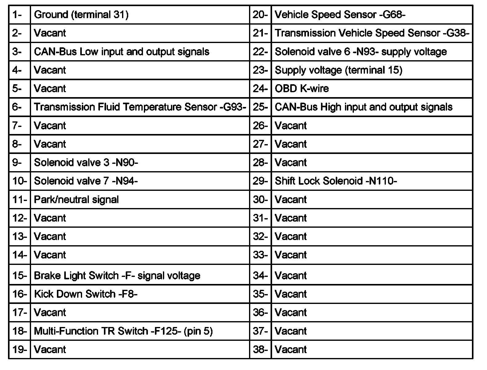 Transmission Control Module (TCM) -J217- 68-pin connector assignment (socket numbers on VAG 1598/18), 01M, 4 Spd. A/T