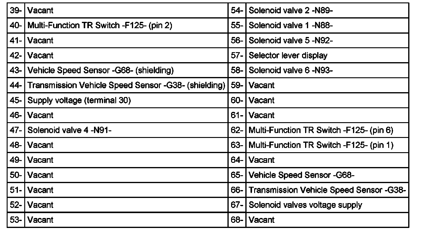 Transmission Control Module (TCM) -J217- 68-Pin Connector Assignment (Socket Numbers on VAG 1598/18)