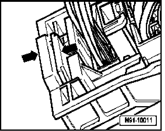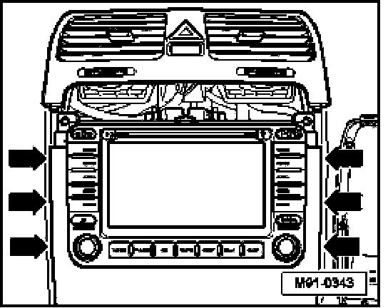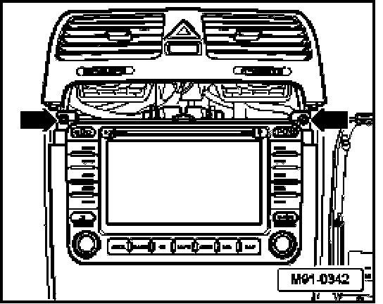 - Use trim removal wedge 3409 to carefully pry off center instrument panel trim in area of - arrows - and remove.