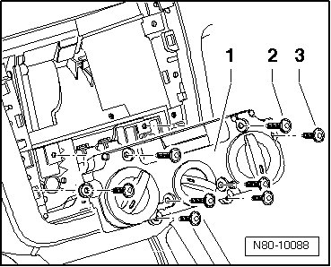 - Remove the bolts - 2 - (4.2 x 45) and - 3 - (4.2 x 16) and the controls - 1 - from the center console.