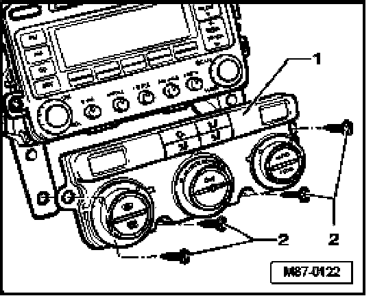 - Remove screws - 2 - and remove A/C Control Head E87 - 1 - from instrument panel.