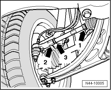 - Loosen lock nut - arrow 3 -, counterhold on tie rod end - arrow 2 - while doing this.