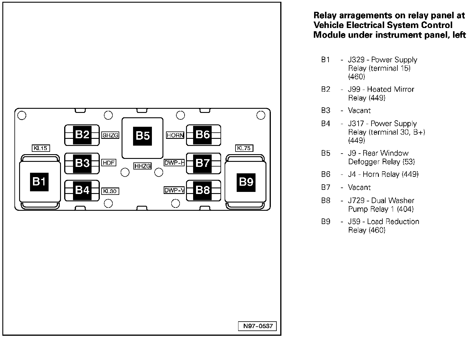 Relay Arrangements On Relay Panel At Vehicle Electrical System Control Module Under Instrument Panel, Left: