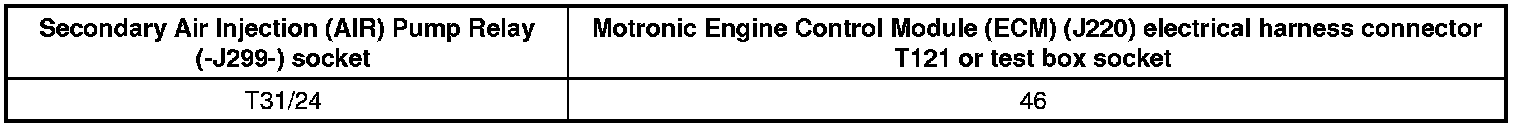 - Check the Secondary Air Injection (AIR) Pump Relay (-J299-) socket T31/24 to the Motronic Engine Control Module (ECM) (J220) electrical harness connector T121 terminal 46 for an open circuit or a short to Battery (+).