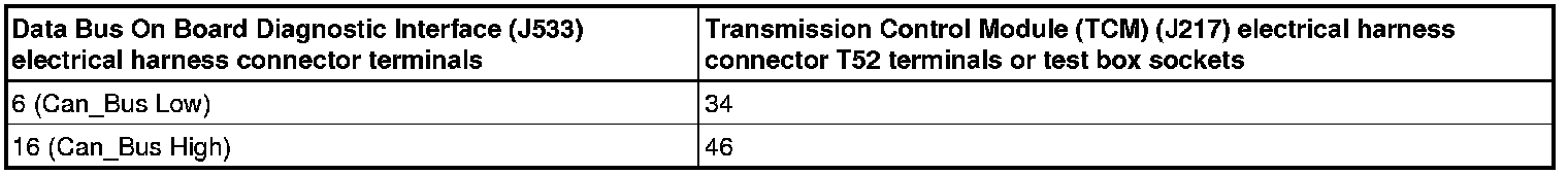 - Using a Multimeter, check the Data Bus On Board Diagnostic Interface (J533) electrical harness connector to the Transmission Control Module (TCM) (J217) electrical harness connector T52 for resistance.