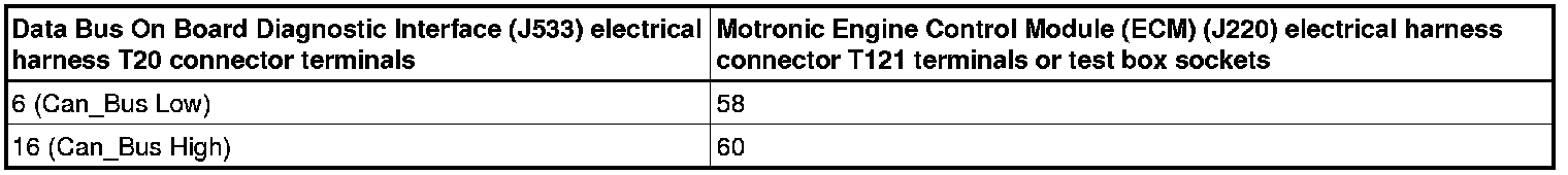 - Using a Multimeter, check the Data Bus On Board Diagnostic Interface (J533) electrical harness connector to the Motronic Engine Control Module (ECM) (J220) electrical harness connector T121 for resistance.