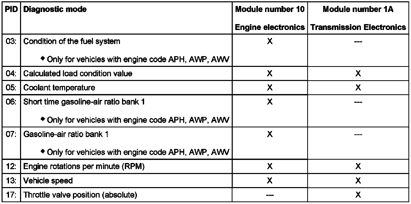 This diagnostic mode displays the operating conditions at which an emission relevant malfunction was detected and stored by the Engine Control Module (ECM) and Transmission Control Module (TCM).