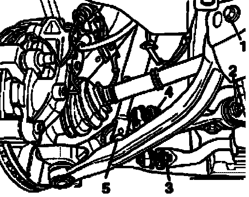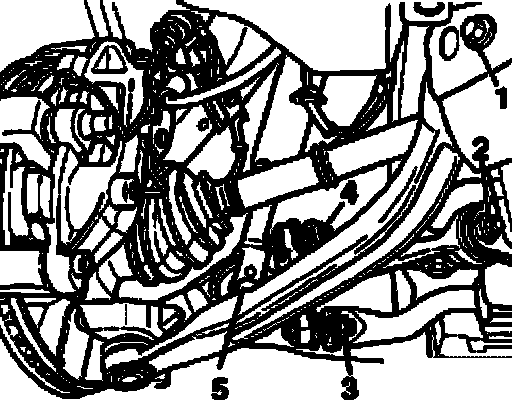 ^ Remove hex nut - 2 - for track-control link on subframe and remove hex bolt.