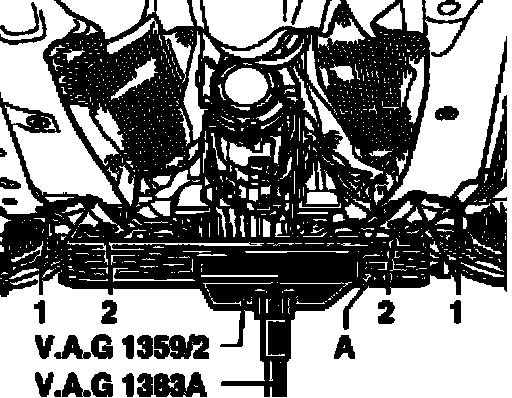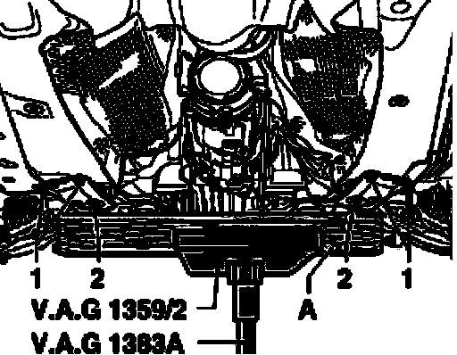 Place engine/transmission jack V.A.G 1383 A with V.A.G 1359/2 under subframe and apply slight counter pressure.