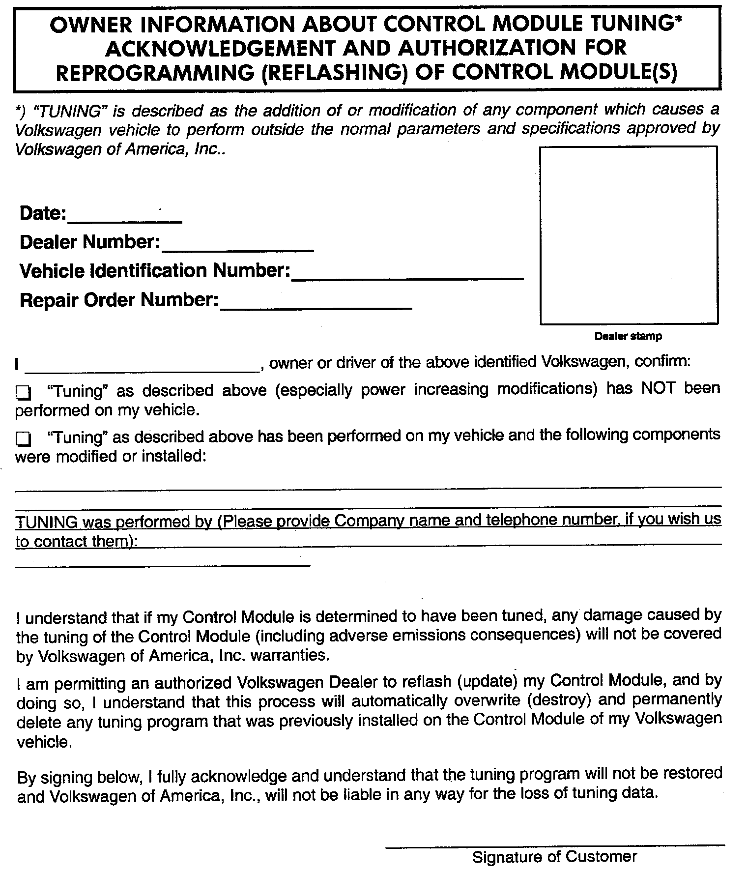 ^ Your Dealership should place the vehicle owner on notice in writing, that their ECM or TCM was found to have been tuned, and that any damage caused by the tuning of the ECM or TCM (including any adverse emissions consequences) will not be covered by Volkswagen of America, Inc. warranties.