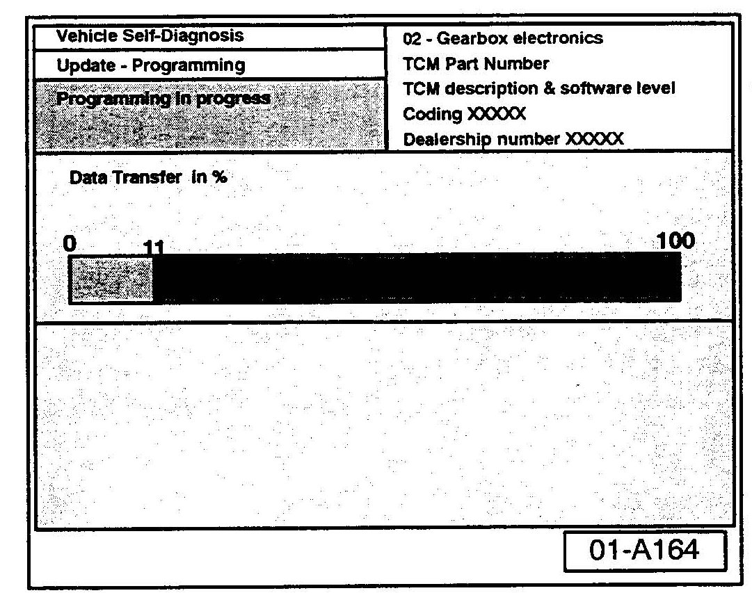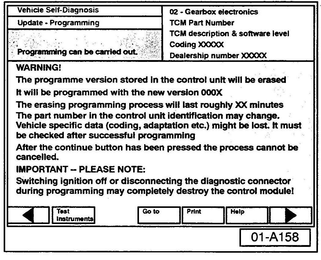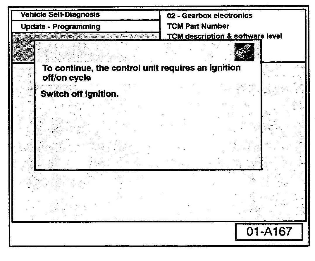 Once "Update - Programming" function has been started1 switching ignition OFF or disconnecting the diagnostic connector may completely destroy the TCM.