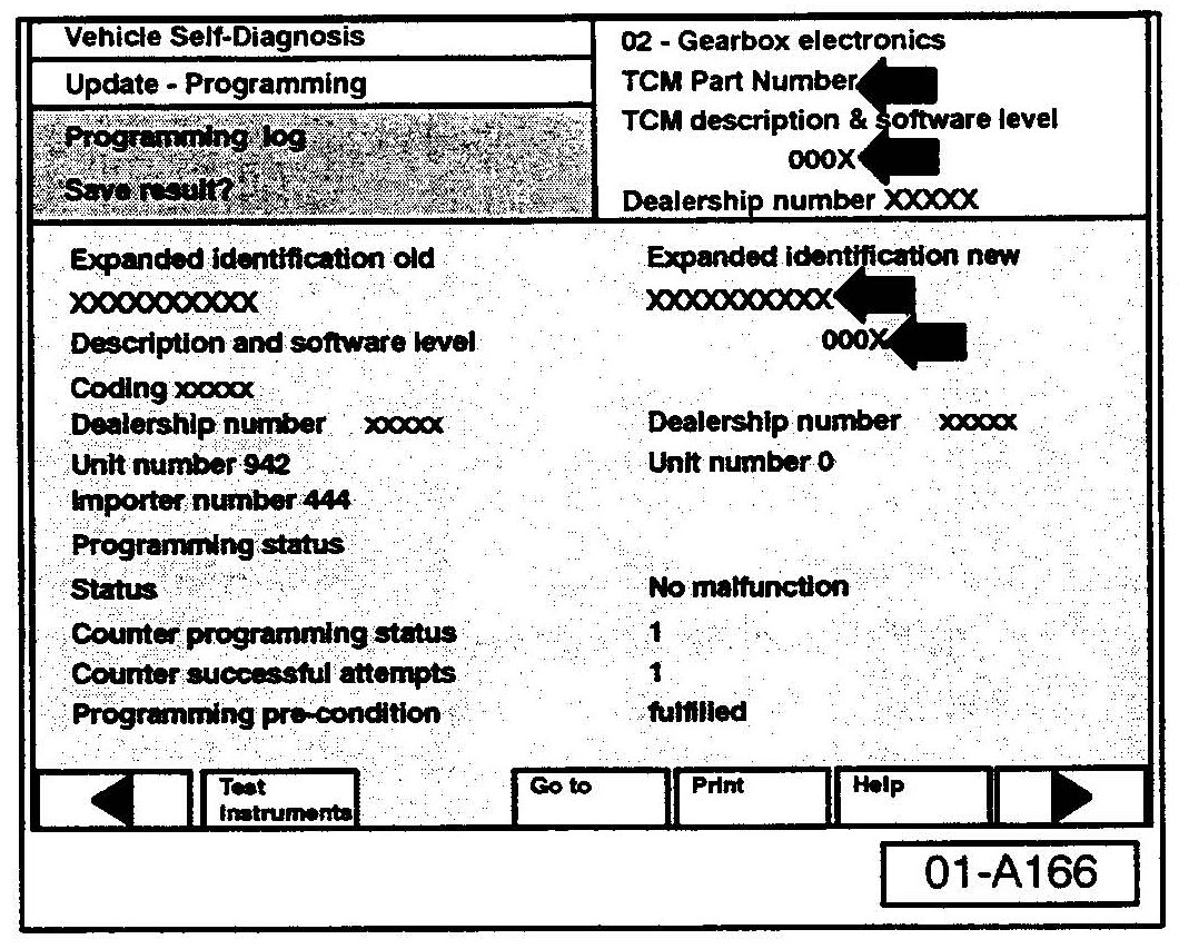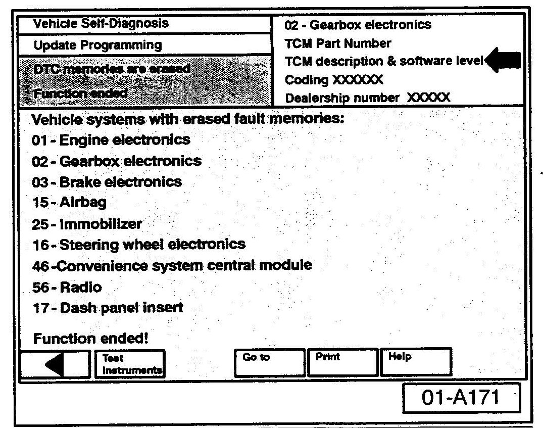 Old software level is still displayed at (arrows). New software level is not displayed until process is complete and fault memories have been erased.