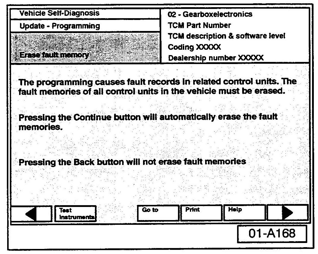 After switching ignition ON, the TCM has been re-initialized, however, fault memories must now be erased.