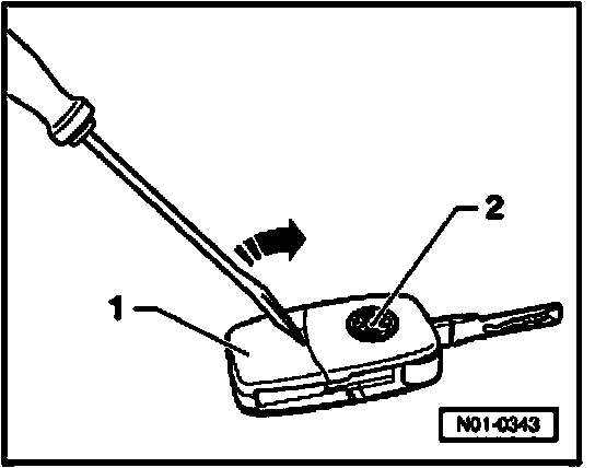- Insert a screwdriver in the slot between the transmitter unit -1- and the main key -2-.
