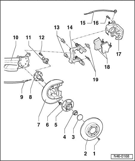 Rear wheel brakes (disc brakes - front wheel drive), assembly overview