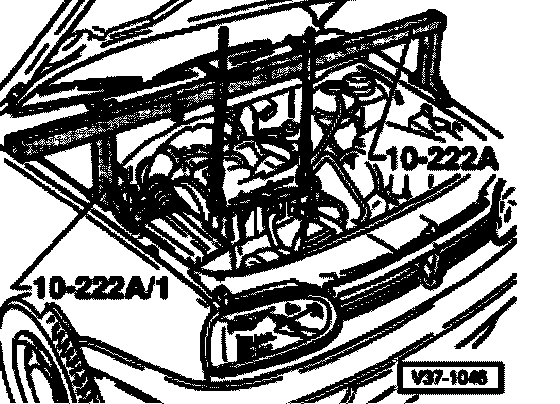 - Install support bar 10-222 A with legs 10-222 A/1 (adapter 10-222 A/3 for 6-cyl. engine) and support engine/transmission in position.