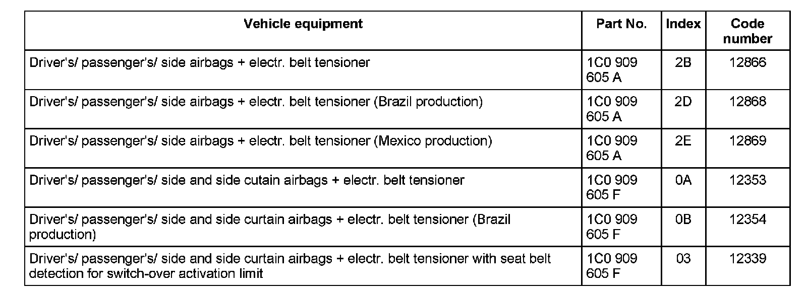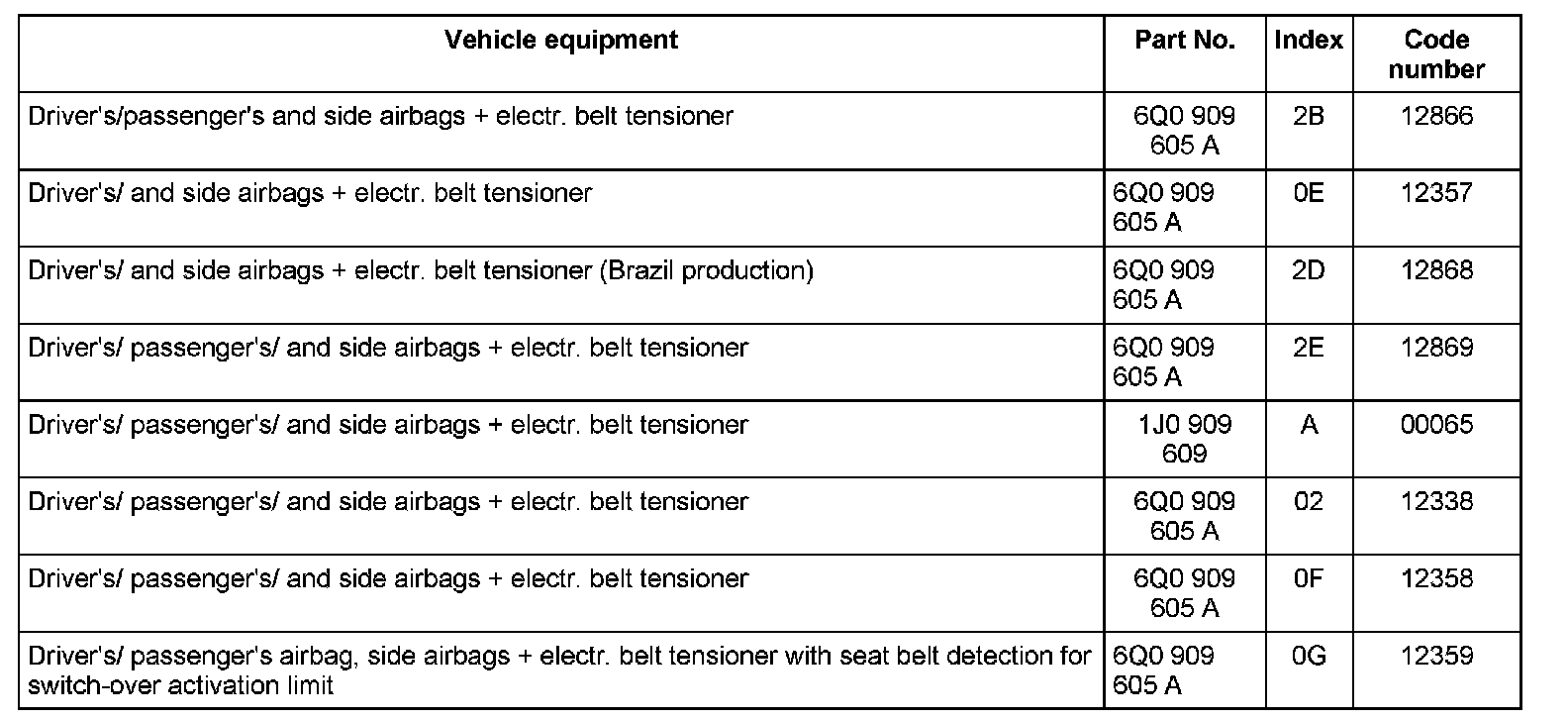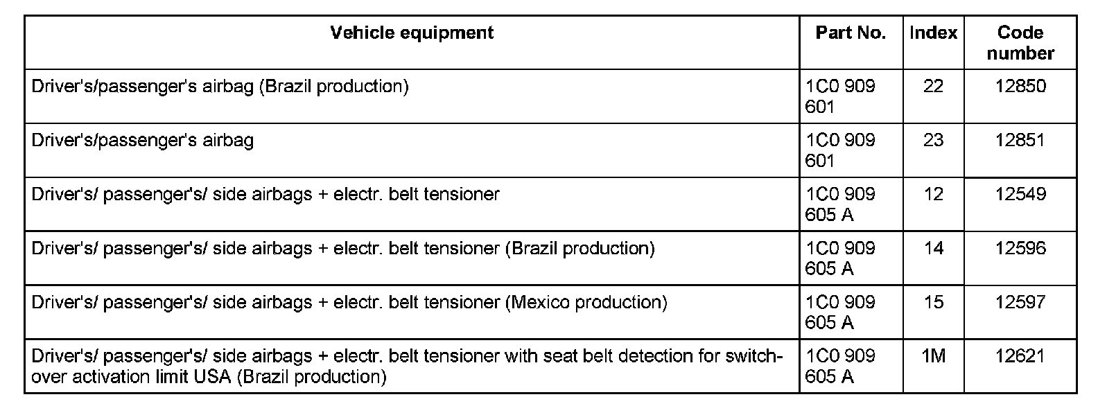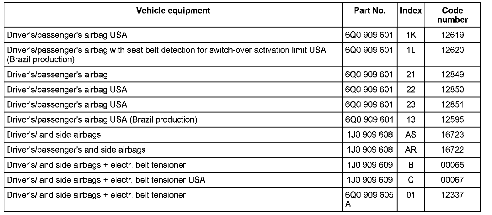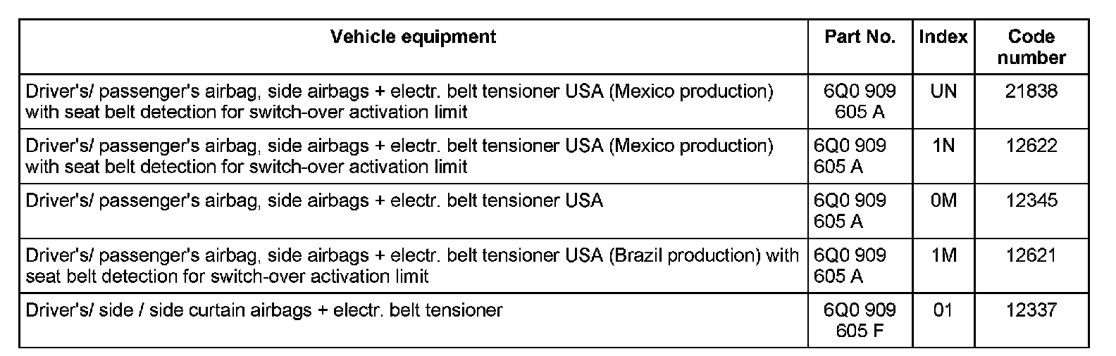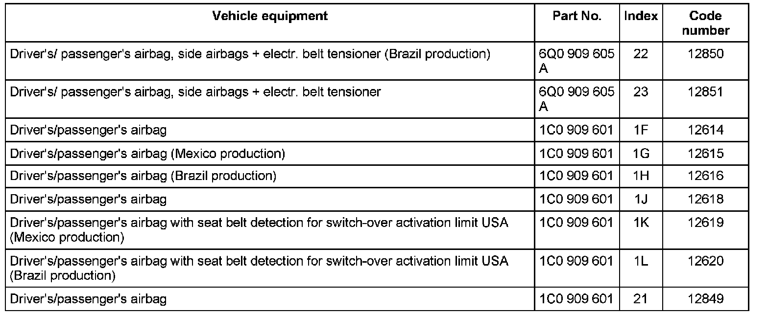 In this case the control module has not been programmed with the relevant data for the vehicle. Coding is then not possible. The Airbag Malfunction Indicator Lamp (MIL) -K75- will not extinguish and lights up continuously. A check must then be completed to see if the correct control module for the vehicle has been installed (compare Part No. and letter index), or whether an incorrect code number has been entered.
