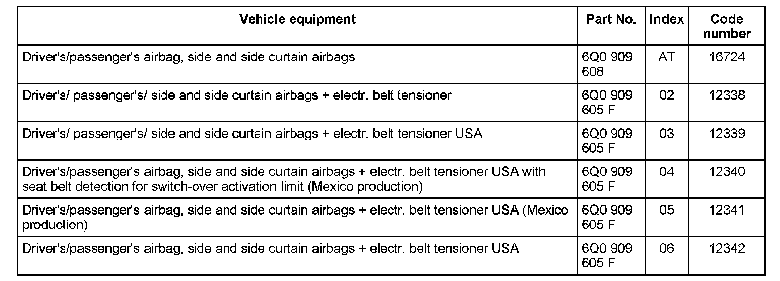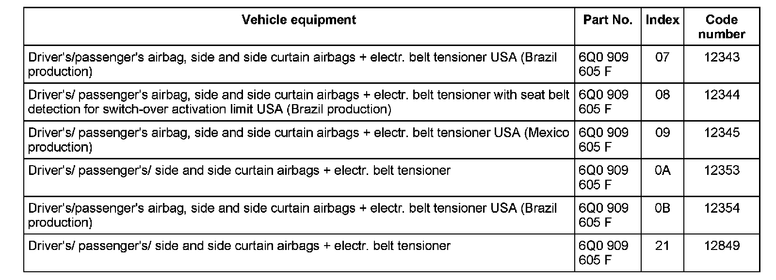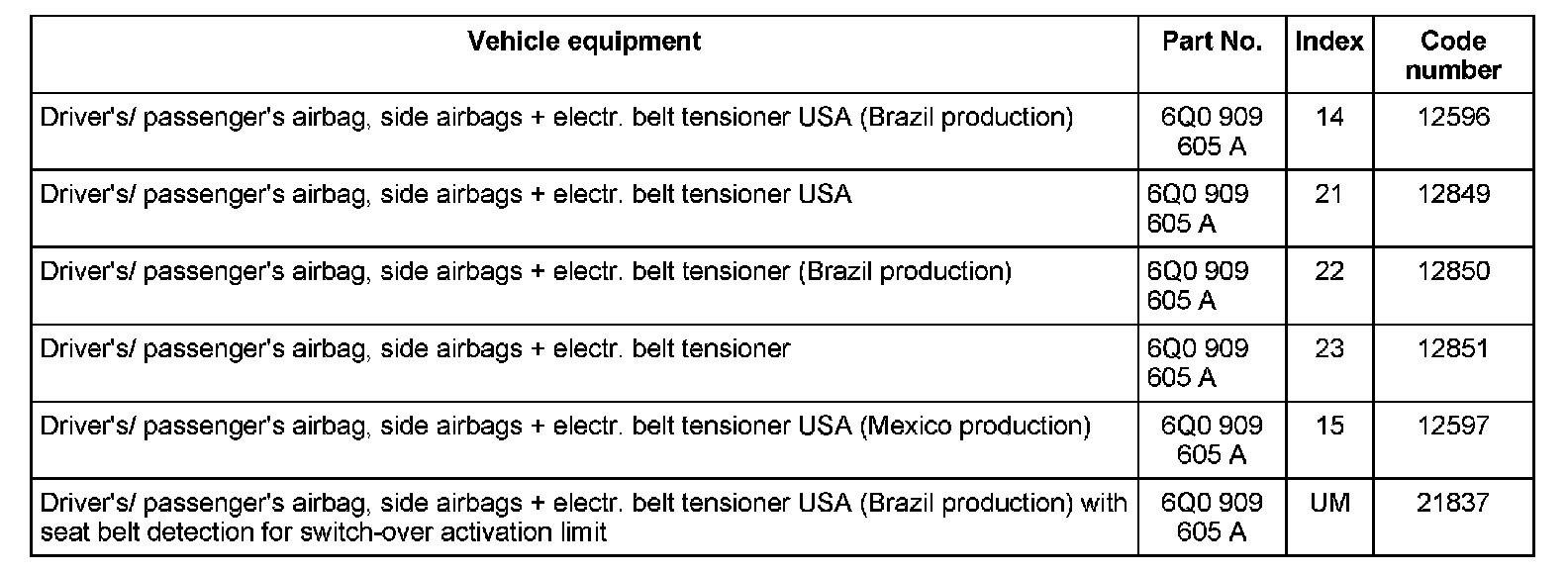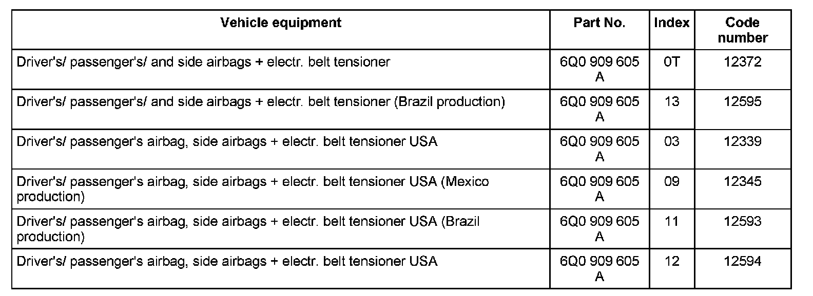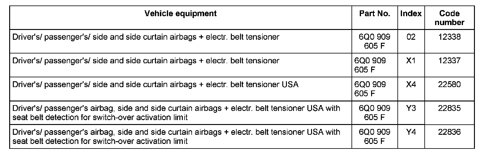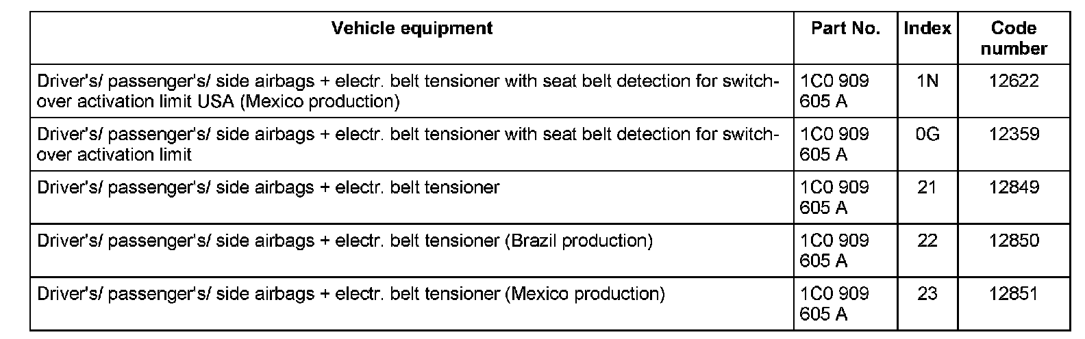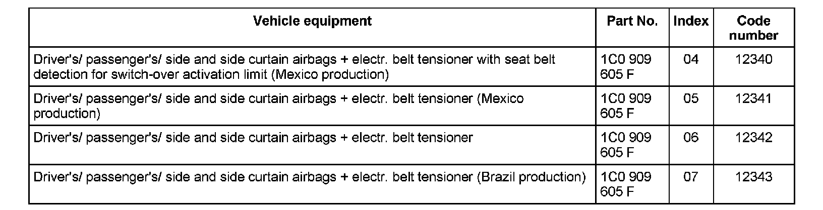 In this case the control module has not been programmed with the relevant data for the vehicle. Coding is then not possible. The Airbag Malfunction Indicator Lamp (MIL) -K75- will not extinguish and lights up continuously. A check must then be completed to see if the correct control module for the vehicle has been installed (compare Part No. and letter index), or whether an incorrect code number has been entered.