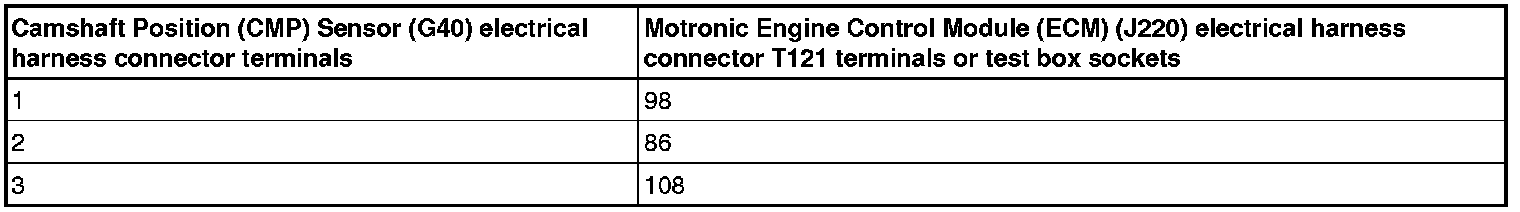 - Using a Multimeter, Check the Camshaft Position (CMP) Sensor (G40) electrical harness connector to the Motronic Engine Control Module (ECM) (J220) electrical harness connector T121 for resistance.