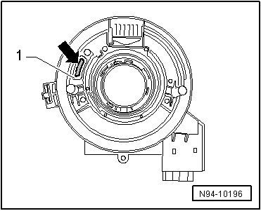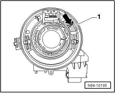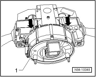 - Lift the retainers - arrows - on airbag spiral spring/return spring with slip ring - 1 - slightly and pull airbag spiral spring/return spring with slip ring back from steering column.