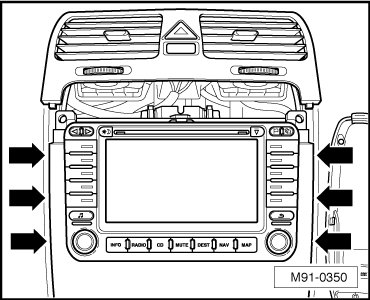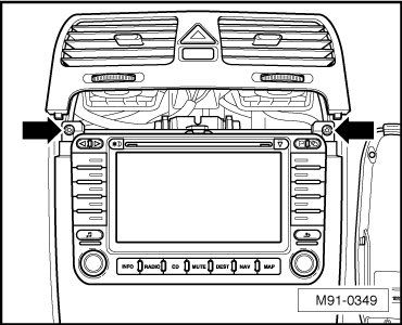 - Remove the screws - arrows - (1.5 Nm) on the radio/navigation display unit control module.