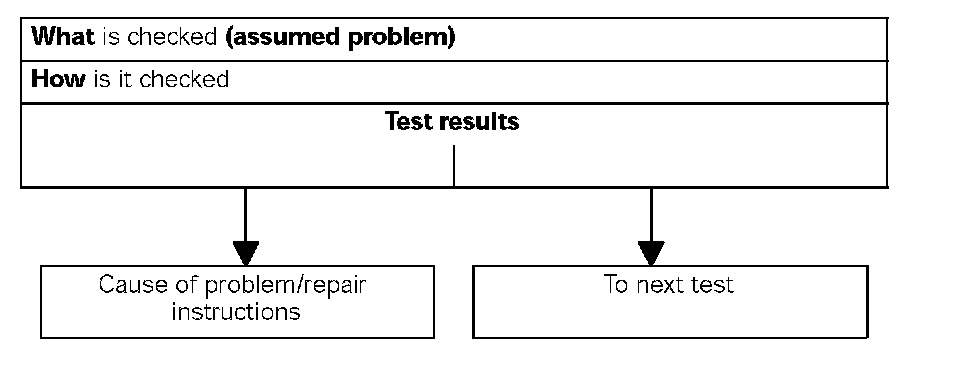 Starting with the reported problem, troubleshooting procedures show step-by-step what is checked and how it is checked in order to find the problem in the quickest and most reliable way. If several causes (of a problem) are possible in one system, a test procedure is used for diagnosis.