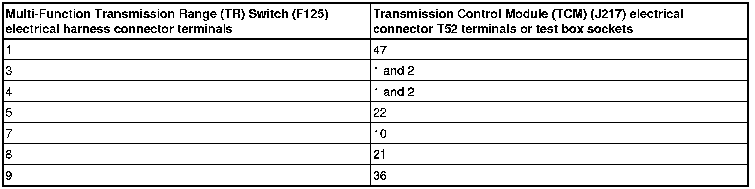 - Using a multimeter, check the Multi-Function Transmission Range (TR) Switch (F125) electrical harness connector terminals to the Transmission Control Module (TCM) (J217) electrical harness connector T52 terminals for resistance.