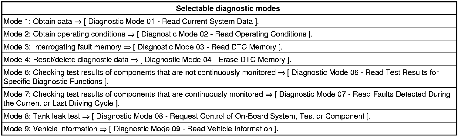 The following table provides a link to all diagnostic modes that monitor all components and systems which influence the emission quality.