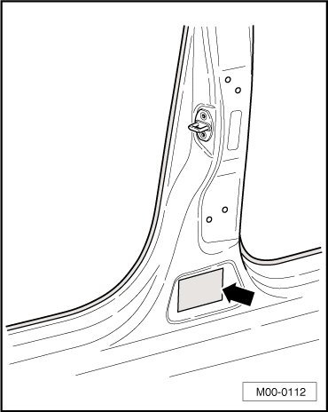 Vehicle data plate - arrow - is secured in spare wheel well on left side in direction of travel.
