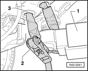 - Remove bolts - 1 - while vehicle stands on wheels. If necessary, lift vehicle until bolts are accessible.