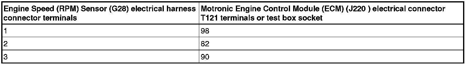 - Using a multimeter, check the Engine Speed (RPM) Sensor (G28) electrical harness connector terminals to the Motronic Engine Control Module (ECM) (J220) electrical harness connector T121 terminals for an open circuit.