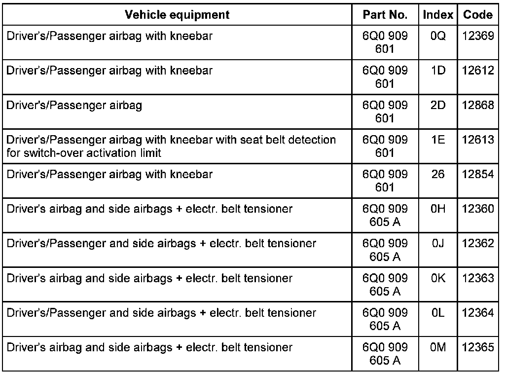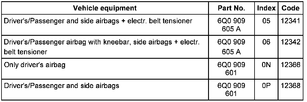 NOTE: Airbag Control Module -J234- current coding numbers can be found in the Vehicle Diagnosis, Testing and Information System VAS 5051.