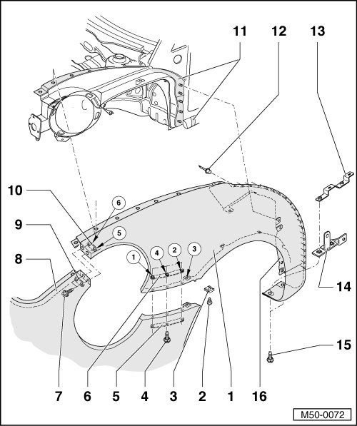 • Overview describes removal and installation of front fender for vehicles through June of 2005. Removal and installation applies to vehicles from July 2005, except slight changes.
