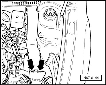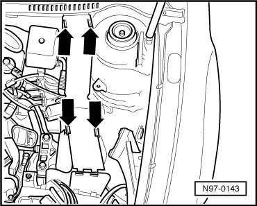 - Unclip the cable router cover at the tabs - arrows - and fold the cover in the direction of travel.