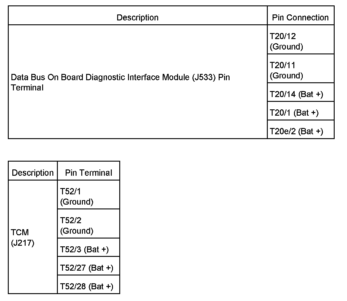 Yes: Test the Power Supply and Grounds circuits to Data Bus On Board Diagnostic Interface Module (J533, Gateway) and TCM (J217) listed below