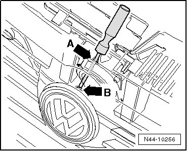 - Guide a screw driver through opening - arrow A - and press tab - arrow B - downward.