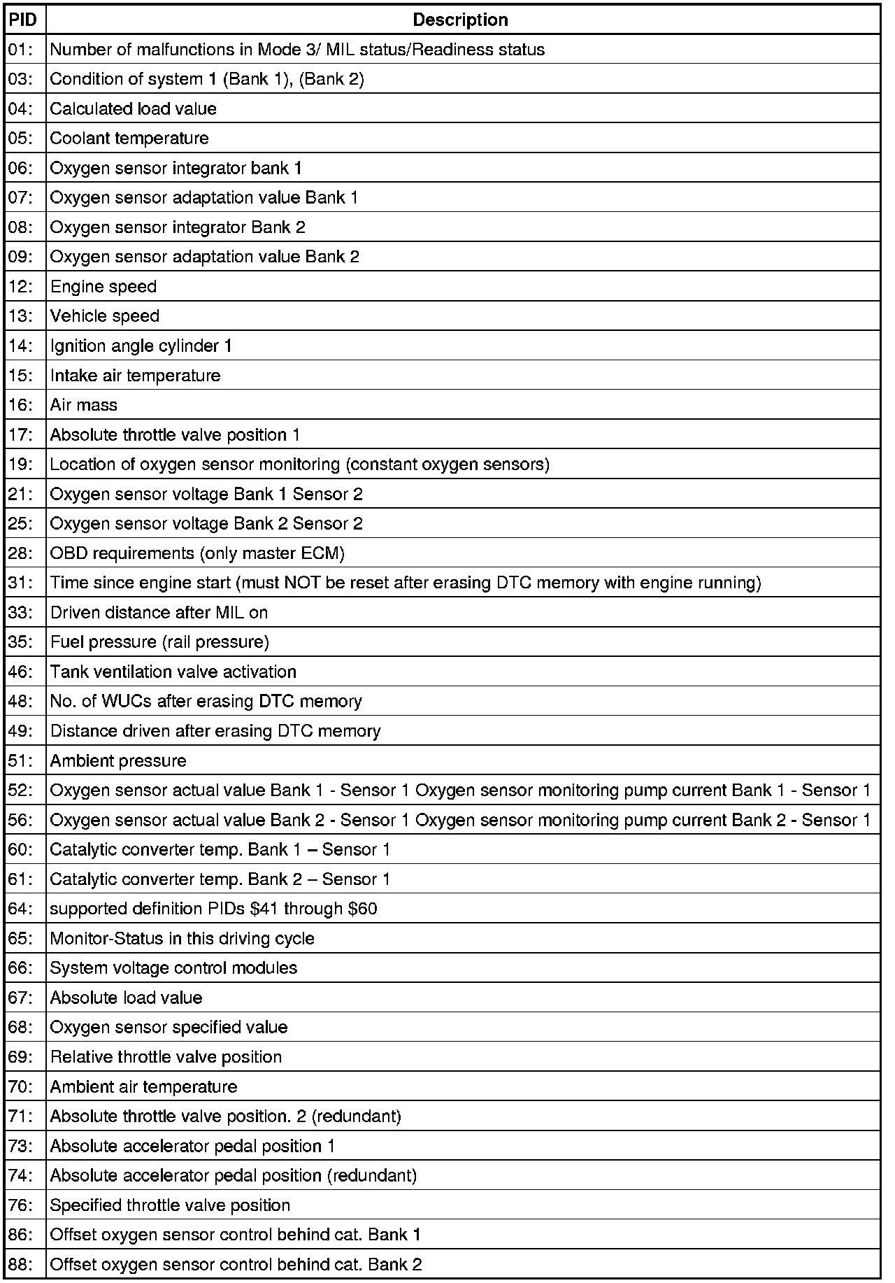 - From the following table, select the desired the "PID" that is to be monitored, e.g. "PID $05 Coolant temperature".