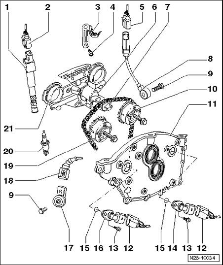 1 - Ignition Coil 1 with Power Output Stage -N70-*, Ignition Coil, 2 with Power Output Stage -N127-*, Ignition Coil, 3 with Power Output Stage -N291-*, Ignition Coil, 4 with Power Output Stage -N292-*, Ignition Coil, 5 with Power Output Stage -N323-* and Ignition Coil, 6 with Power Output Stage -N324-* 1